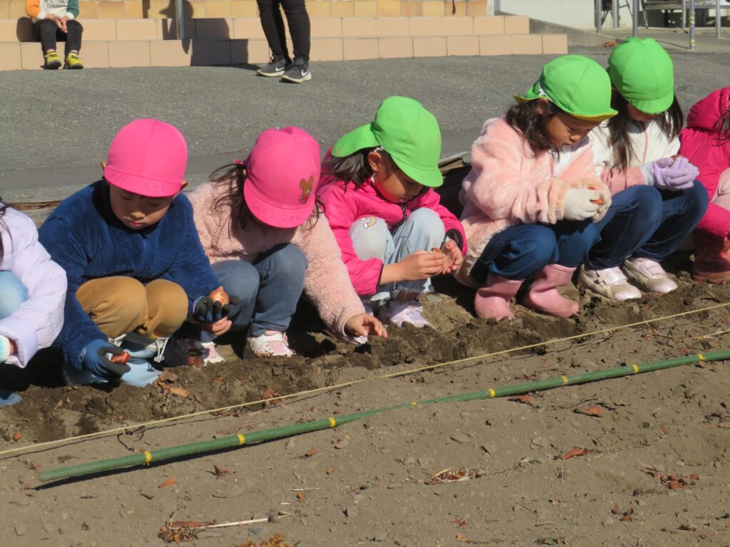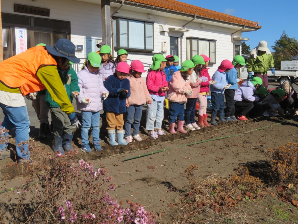 最初に「花咲かせたい」のお話を真剣な顔で聞いてくれた子どもたち。寒いけれど、初めての体験にわくわくした様子でした。