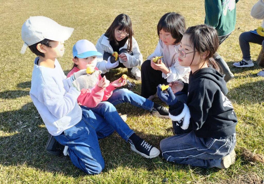 イモが焼けるまでの間、芝生の広場で,縄跳び・鬼ごっこ、新聞紙で作ったフリスビーを楽しみました。